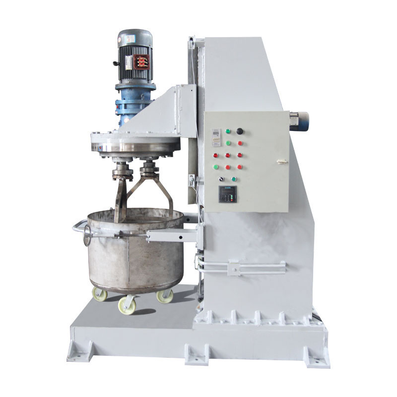 3、料筒:物料在不銹鋼材質(zhì)的料筒內(nèi)進行攪拌。料筒裝在升降平臺上,通過油缸實現(xiàn)升降。料筒下部裝有滾輪,可以推進。拉出。當(dāng)攪拌器旋轉(zhuǎn)時,料筒由擺線針輪減速機通過凸輪和滾輪帶動同時旋轉(zhuǎn),旋轉(zhuǎn)方向可以選擇。控制面板上裝有變頻調(diào)節(jié)旋鈕,可以根據(jù)工藝要求調(diào)節(jié)旋轉(zhuǎn)速度。